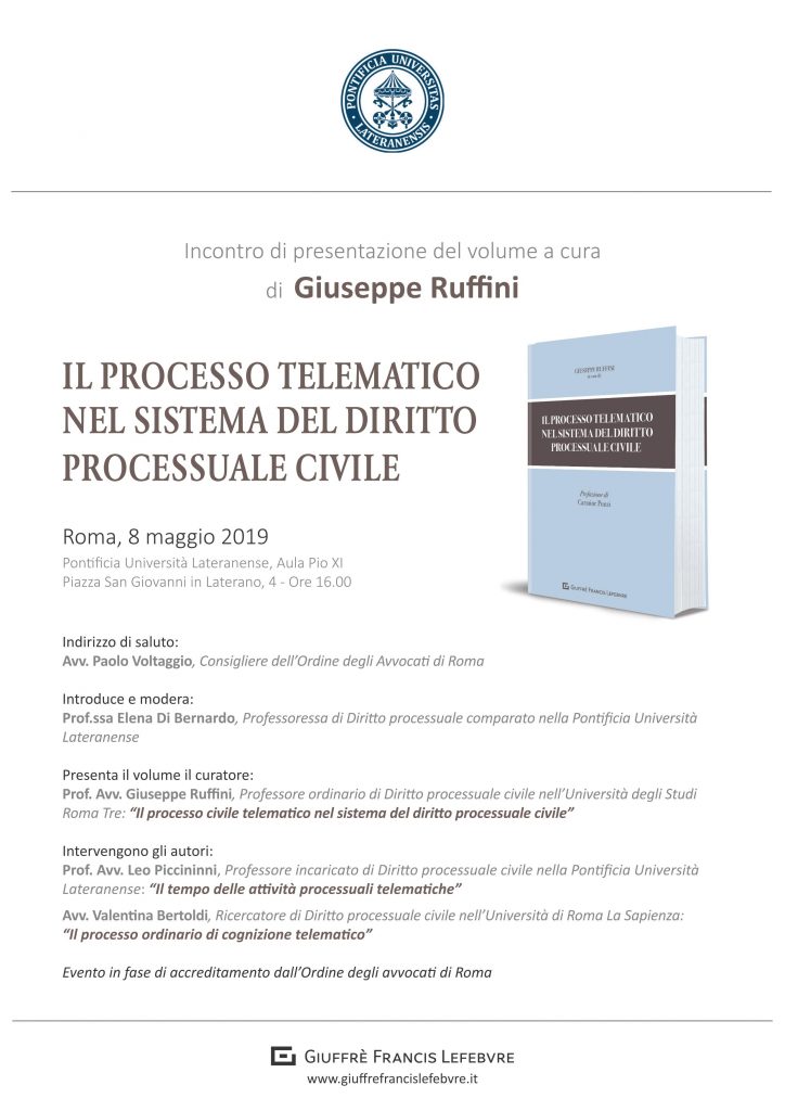 La Pontificia Università Lateranense ospiterà il prossimo 8 maggio, nell’Aula Pio XI, l’incontro di presentazione del volume a cura di Giuseppe Ruffini “Il processo telematico nel sistema del diritto processuale civile“.